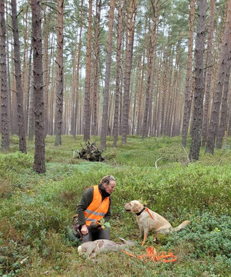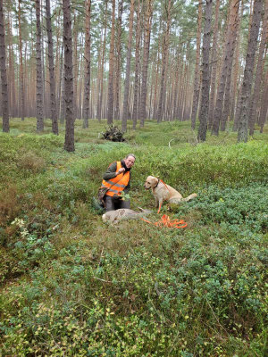 Auch in diesem Jahr sind wir jagdlich wieder viel unterwegs. Bei jedem Ansitz ist Ava jetzt mit dabei, nach ihre VschwP werde ich ihr jetzt für die Schweissarbeit nehmen. Ila war schon paar mal mit zur Treib und Druckjagd. Bei der Treibjagd hab ich sie selbst mit dabei und da wo es Druckjagd gibt geht sie, wenn ich sitze, mit Paul mit durch. Auch Maeve hat ihre erste jagdliche Erfahrung sammeln dürfen. Wir hatten die tolle Chance mit zu gehen auf Enten und da hat sie die erste frisch erlegte Enten apportieren können, Markierung über ein Graben und eine Suche, und am Ende fast in die Dämmerung noch eine nachsuche. Eine tolle Erfahrung wo wir sehr dankbar für sind! Und letzte Woche dürfte Maeve denn mit mama Ila mit für ein paar Treiben in meine eine Jagd. Erst ein kleines treiben aleine und denn gemeinsam mit Ila. Eine Freude für Hund und Mensch.