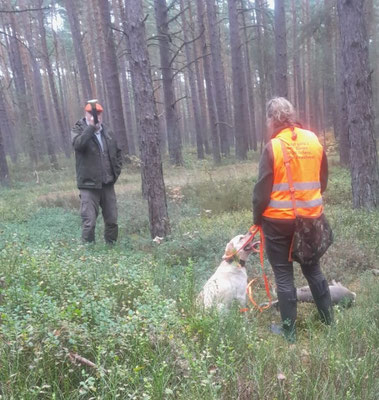 Mittlerweile hat Maeve ihre erste Einsätze mit Nachsuche hinter sich gebracht. Ein Kontroll Anschuss Suche , da wurde bestätigt der Jäger hat vorbei geschossen. Und ein Nachsuche nach der Druckjagd wo sie mit eine Ruhe und Konzentration gearbeitet hat, der Anschuss und Schweiss zeigte sie, sowei Wundbett. Die Nachsuche musste am grenzweg zu Forst erstmal abgebrochen werden. Am nächsten Tag hat ein BGS Hund die fährte nochmal nach gearbeitet, Da hat sich bestätigt was wir auch vemutet haben Streifschuss.
