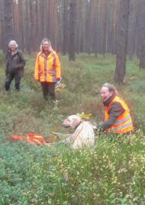 Ein traumhaftes Wochenende liegt hinter uns. Mit Ila hatte ich ein wunderschönen Ansitz wo ich ein Böckchen erlegen konnte, mit ein sauberen Schuss sprang das Böckchen doch ab und fing die Arbeit für Ila an. Anschuss sofort gefunden, sauberen Lungenschweiss und ohne Hund das Stück nicht gefunden, flüchstrecke so 90 Meter aber in die Dickung mit Brombeer und co, also ein kräftiges Suchenheil für Ila! Sonntag stand der Verbands Fährten Schuh Prüfung 1000 Meter, mit Maeve an. Nachdem wir in Juni die Vereinsprüfung 1000 Meter schon gemeistert hatten, haben wir aber weiterhin geübt mit unsere Truppe.Für diesen Verbandsprüfungen braucht man ein Lautnachweis, Maeve jagt (wie Ila) laut an Haarwild. DIe Prüfung war in WInsen Aller in ein wunderschönes Revier, es gab 2 Richtergruppen mit 5 Teilnehmer wovon eine die 40 STunden Fährte gelaufen hat. Wir haben alle bestanden! Ich habe wiederum sehr viel Lob bekommen für die tolle, ruhige Arbeit von Maeve, und unsere Team Arbeit. Ich war super zufrieden und stolz, dieses mal haben wir die 1000 Meter ohne Abruf gemeistert. Im Suchenlokal gab es nach super lecker Essen die Urkunden. Und ein wirklich sehr grosse Überraschung: Maeve und ich haben den Wanderpokal bekommen fü die tolle Arbeit die wir zusammen gemeistert haben und waren damit Suchensieger.... Ich bin wirklich sehr stolz auf uns und danke alle die uns immer zu Seite stehen.