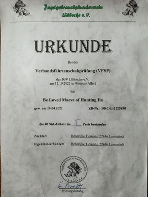 Letzten Donnerstag der 19.Oktober hab ich Maeve zur VPS geführt in Visbek, da wo ich vor 6 Jahre mit Ila auch war. Es war, nach anfangs sehr schlechtes Wetter, ein wunderschönen netten Prüfungstag, mit nette Truppe und sehr nette Richter . Alle Hunde haben tolle Arbeit gezeigt und den Lob bekommen sehr gut ausgebildet und vorbereitet angetreten zu sein. Sehr stolz sind wir das Maeve jetzt auch die VPS gemeistert hat und damit tauglich ist für die Jagdliche Leistungszucht. Auf geht es jetzt in die Jagdsaison und wir blicken nach vorne für weitere Ziele zum erarbeiten.